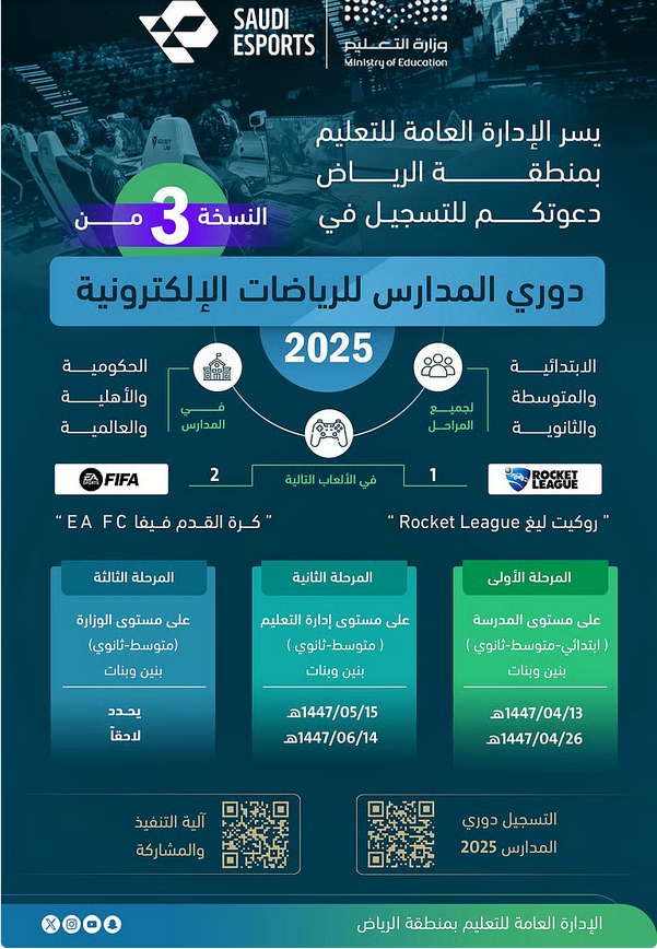 أعلنت الإدارة العامة للتعليم بمنطقة الرياض، بالتعاون مع الاتحاد السعودي للرياضات الإلكترونية، عن انطلاق النسخة الثالثة من دوري المدارس للرياضات الإلكترونية 2025، ودعت جميع المدارس الحكومية والأهلية والعالمية إلى التسجيل والمشاركة في المنافسات.