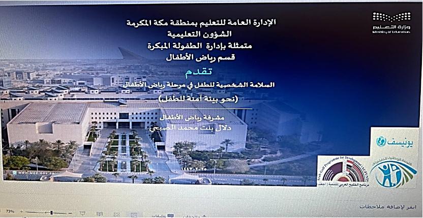 نفذت الإدارة العامة للتعليم بمنطقة مكة المكرمة ممثلةً في إدارة الطفولة المبكرة برنامج السلامة الشخصية في مرحلة رياض الأطفال بعنوان (نحو بيئة آمنة) في مرحلته الأولى عبر برنامج التيمز في يوم الثلاثاء الموافق 10 / 7 / 1447هـ حيث استمر على مدار ثلاثة أيام بقيادة المدربة دلال الصبحي وتحت إشراف مديرة إدارة الطفولة المبكرة ، وذلك بحضور (377) تربوية .