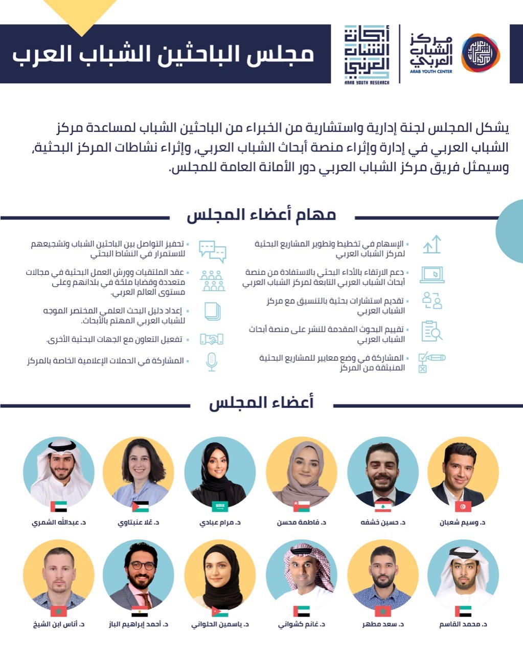 كشف مركز الشباب العربي في أبوظبي عن أعضاء مجلس الباحثين الشباب العرب وعقد اجتماعه الأول بعد اعتماد أعضائه الذين سيباشرون مهامهم في الإشراف على منصة أبحاث الشباب العربي ودعم الارتقاء بالبحث العلمي عربياً وتطوير النتاج البحثي للعقول العربية الشابة والمساهمة في توجيه تطبيقاته العملية نحو مسارات التنمية وصناعة فرص مستقبلية للشباب في المجتمعات العربية.