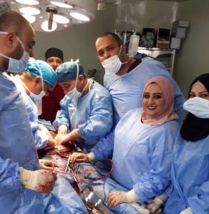 تدريسي في كلية طب المستنصرية يجري عملية جراحية فوق الكبرى لتحرير التصاقات الأمعاء الدقيقة مع رفع ورم في جدار البطن لمريضة في مستشفى اليرموك التعليمي