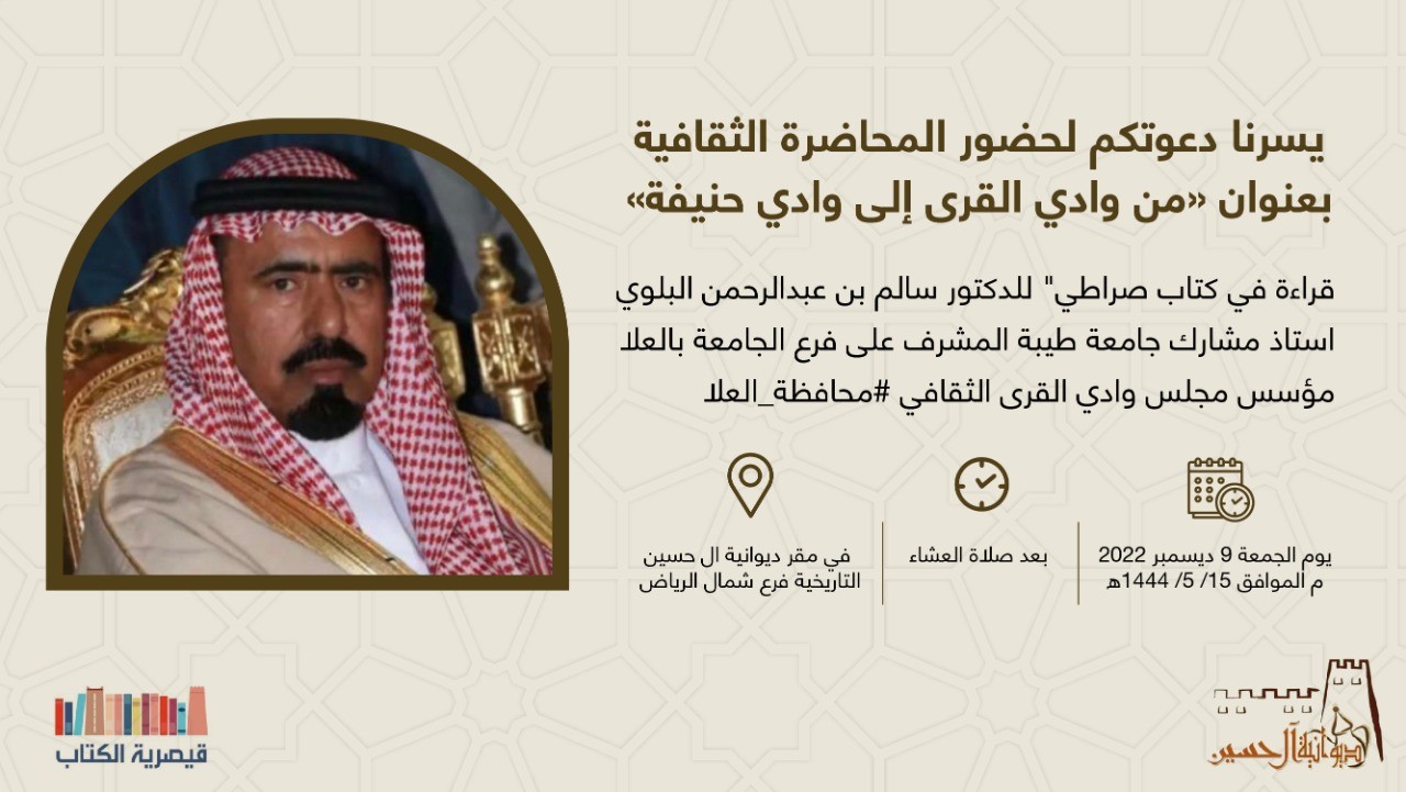 أقامت ديوانية الحسين التاريخية بالرياض مساء يوم الجمعة ١٥ / ١٤٤٤/٥ هـ الموافق ٢٠٢٢/١٢/٩ م ، محاضرة بعنوان (من وادي القرى إلى وادي حنيفة قراءة في كتاب صراطي)