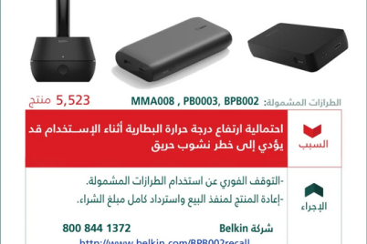 أعلنت وزارة التجارة، اليوم (الأحد)، استدعاء 5.5 ألف حامل وشاحن لاسلكي belkin، لاحتمالية ارتفاع درجة حرارة البطارية أثناء الاستخدام؛ قد...