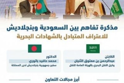 وقعت المملكة العربية السعودية ممثلة بالهيئة العامة للنقل مذكرة تفاهم للاعتراف المتبادل بشهادات البحارة بين حكومة المملكة وجمهورية بنجلاديش،...
