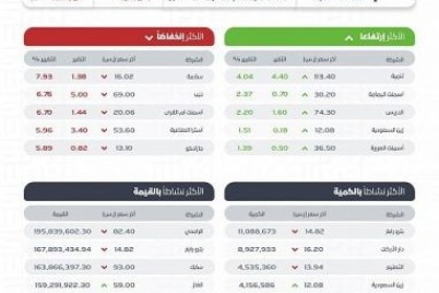: أغلق مؤشر الأسهم السعودية الرئيس اليوم منخفضًا 129.56 نقطة ليقفل عند مستوى 11421.78 نقطة, وبتداولات بلغت قيمتها 3.9...