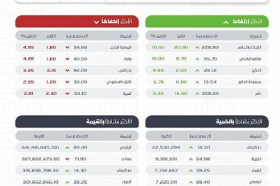 أغلق مؤشر الأسهم السعودية الرئيسة اليوم مرتفعًا 101.60 نقطة ليقفل عند مستوى 12646.74 نقطة, وبتداولات بلغت قيمتها 7 مليارات ريال.وبلغت...