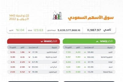 أغلق مؤشر الأسهم السعودية الرئيسة اليوم مرتفعًا 123.63 نقطة ليقفل عند مستوى 11987.97 نقطة, بتداولات بلغت قيمتها 5.6 مليارات ريال....