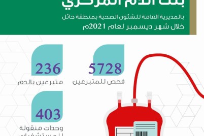 حائل - عبدالله الحايطي أجرى بنك الدم المركزي بصحة حائل خلال شهر ديسمبر من عام 2021م، “5728” فحصاً مخبرياً، وصرف...