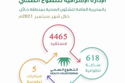حائل - عبدالله الحايطي نفذت المديرية العامة للشؤون الصحية بمنطقة حائل ممثلةً في الإدارة الإشرافية للتطوع الصحي خلال شهر سبتمبر...