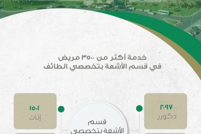 الطائف - إبراهيم البلوشي خدم قسم الأشعة بمستشفى الملك عبدالعزيز التخصصي بالطائف خلال الأسبوع المنصرم 3598 مريض ومراجع منهم 2097...