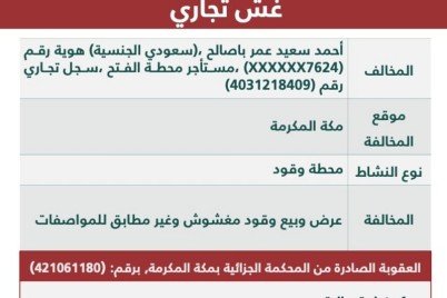 شهرت وزارة التجارة بمستأجر محطة وقود بمكة المكرمة بعد صدور حكم قضائي بإدانته بمخالفة نظام مكافحة الغش التجاري إثر تورط...