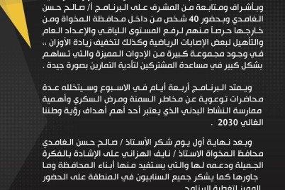 المخواة-جاسم الغامدي تم البدء في البرنامج الرياضي ( صحتك تهمنا ) بمحافظة المخواة -بفضل الله -على ملعب الأولمبي عصر...