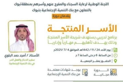تبوك - عبير الشمري تنظم اللجنة الوطنية لرعاية السجناء والمفرج عنهم واسرهم بمنطقة تبوك بالتعاون مع بنك التنمية الاجتماعية اليوم...