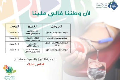 الأحساء - جاسم العبود أطلق تجمع الأحساء الصحي اليوم الأحد، حملة للتبرع بالدم، تحت شعار #دام_دمك، تزامنا مع ذكرى...