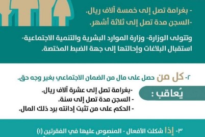 الرياض - صالحه القحطاني حذرت النيابة العامة من الحصول على أموال من الضمان الاجتماعي دون وجه حق، موضحة أن العقوبة...