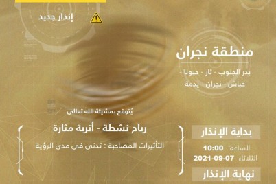 نجران - أدهم اليامي نبه المركز الوطنيّ للأرصاد، من رياح سطحيّة نشطة مثيرة للأتربة والغبار، تؤدّي إلى تدنٍ في مدى...