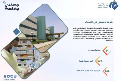 الأحساء - جاسم العبود بلغ إجمالي عدد الوصفات الطبية التي تم صرفها عبر خدمة "وصفتي" أكثر من 523 ألف وصفة...
