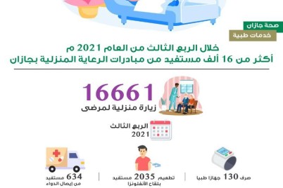 جــازان - عـــادل عمر نفَّذت فرق الرعاية الصحية المنزلية بصحة جازان عدد " 16661 " زيارة منزلية للمرضى المستفيدين من...