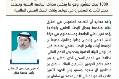 جازان - نوح مجممي أشاد معالي رئيس جامعة جازان الأستاذ الدكتور مرعي بن حسين القحطاني بتقدم الجامعة في مجال البحث...