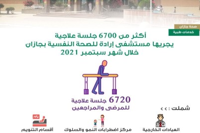 جازان - حسين معشي أجرى مستشفى إرادة للصحة النفسية بجازان 6720 جلسة علاجية للمرضى والمراجعين خلال شهر سبتمبر من العام...