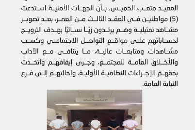 الحدود الشمالية - خلف جويبر صرح المتحدث الإعلامي لشرطة منطقة الحدود الشمالية العقيد متعب الخميس، بأن الجهات الأمنية استدعت (5)...