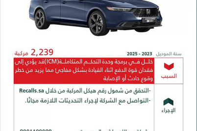 أعلنت وزارة التجارة عن استدعاء 2,239 مركبة من نوع «هوندا – أكورد هايبرد»، موديلات 2023 – 2025، وذلك لوجود خلل...