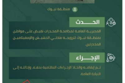قبضت مكافحة المخدرات على مواطن بمنطقة تبوك لترويجه مادتي الحشيش والإمفيتامين المخدرتين. وقد تم إيقافه واتخاذ الإجراءات النظامية بحقه وإحالته...