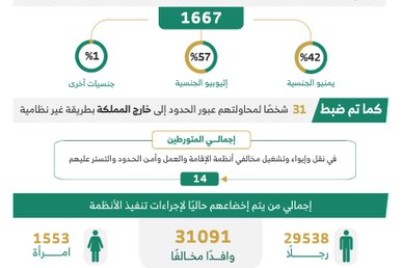 أسفرت الحملات الميدانية المشتركة لمتابعة وضبط مخالفي أنظمة الإقامة والعمل وأمن الحدود، التي تمت في مناطق المملكة كافة، وذلك للفترة...