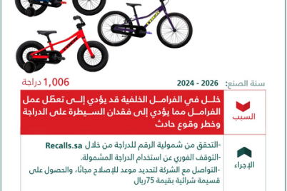دعت وزارة التجارة اليوم، الأربعاء، إلى التوقف الفوري عن استخدام 1,006 دراجات أطفال من طراز Precaliber، المصنعة من قِبل شركة...