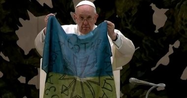 وكشف البابا فرنسيس إن العلم الأوكرانى المتسخ والملطخ، الذي عليه كتابات ورموز، تم إحضاره إليه من بوتشا أمس الثلاثاء.
