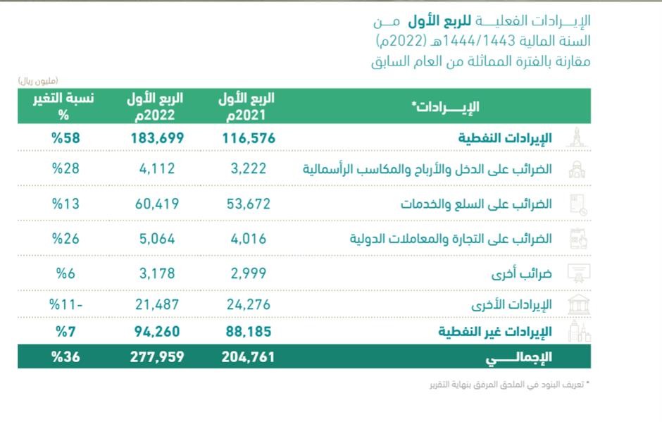 وسجلت الإيرادات النفطية أعلى عائد بـ 183.6 مليار ريال بنسبة تغير 58% عن نفس الربع العام الماضي، فيما سجلت الإيرادات غير النفطية 94.2 مليار ريال بنسبة تغير 7% مقارنة بنفس الربع العام الماضي، ومن بينها الضرائب على السلع والخدمات 60.4 مليار ريال، والضرائب على التجارة والمعاملات الدولية 5.5 مليار ريال.