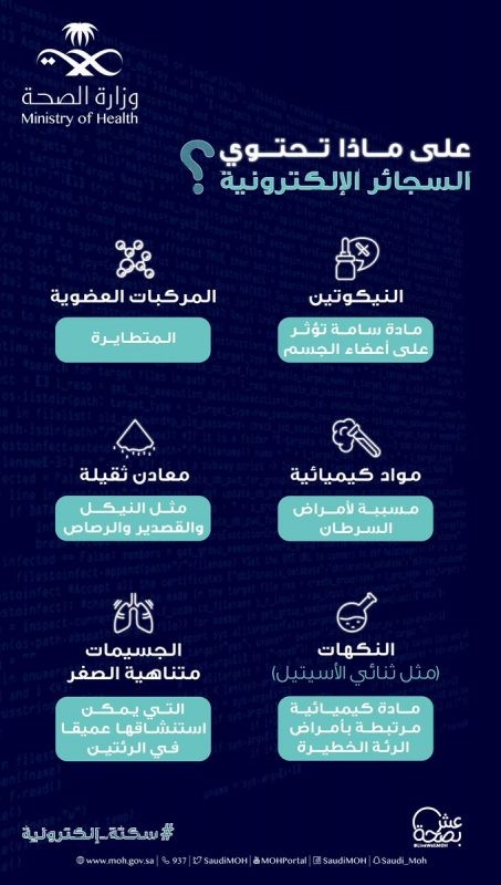 وقالت الوزارة، إن السجائر الإلكترونية تحتوي على النيكوتين، منبهة إلى أنها تحتوي على مواد كيميائية ومعادن ثقيلة تؤثر سلبًا على صحتك.