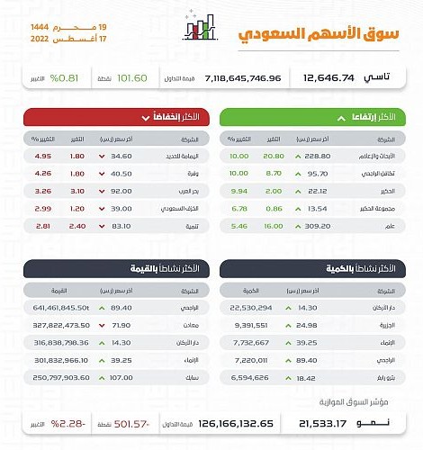 أغلق مؤشر الأسهم السعودية الرئيسة اليوم مرتفعًا 101.60 نقطة ليقفل عند مستوى 12646.74 نقطة, وبتداولات بلغت قيمتها 7 مليارات ريال.
