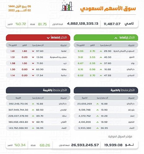 أغلق مؤشر الأسهم السعودية الرئيس اليوم مرتفعًا 81.75 نقطة ليقفل عند مستوى 11487.07 نقطة, وبتداولات بلغت قيمتها 4.8 مليارات ريال.