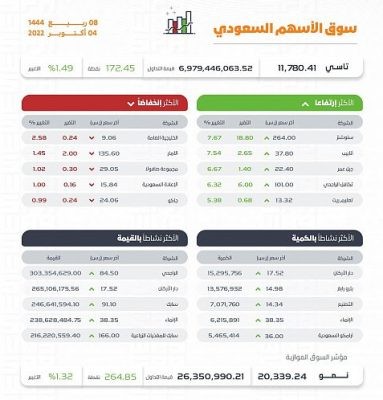 أغلق مؤشر الأسهم السعودية الرئيس اليوم، مرتفعًا 172.45 نقطة ليقفل عند مستوى 11780.45 نقطة, وبتداولات بلغت قيمتها 6.9 مليارات ريال.