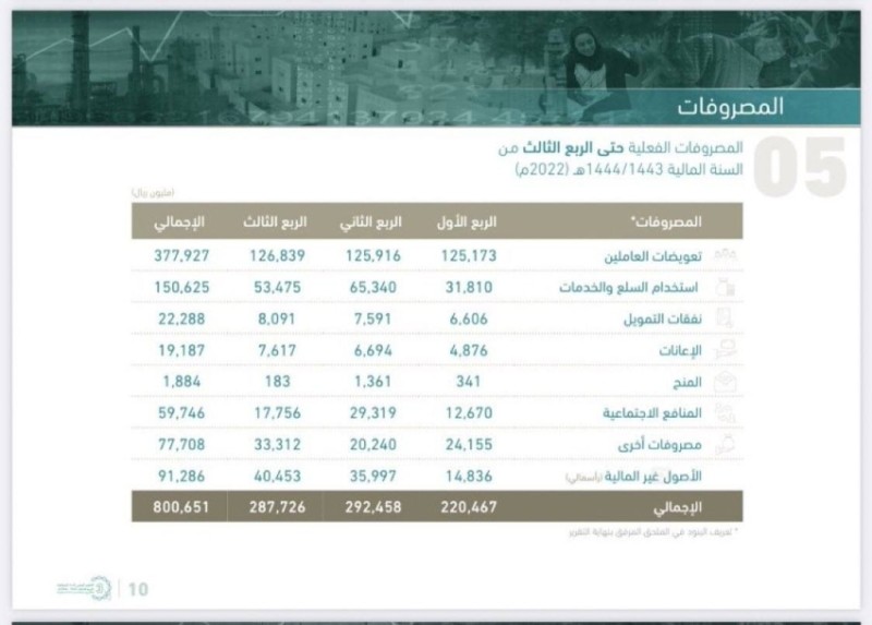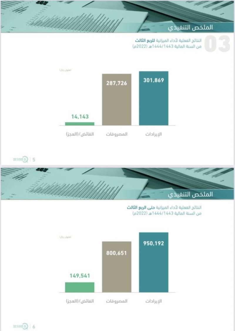 سجلت الميزانية فائضاً نحو 14.14 مليار ريال في الربع الثالث من 2022، بعد تسجيل إيرادات نحو 301.87 مليار ريال مقابل مصروفات نحو 287.73 مليار ريال.