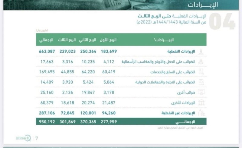 وسجلت الميزانية منذ بداية العام الحالي حتى نهاية الربع الثالث إيرادات نحو 950.19 مليار ريال مقابل مصروفات نحو 800.65 مليار ريال، مسجلة فائضاً نحو 149.54 مليار ريال. وبلغت الإيرادات النفطية خلال التسعة أشهر نحو 663.09 مليار ريال، فيما بلغت الإيرادات غير النفطية نحو 287.1 مليار ريال