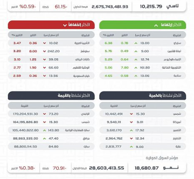 وكانت أسهم شركات: سايكو، وأمانة للتأمين، والإنماء طوكيو م، والتطويرية الغذائية، وسلامة الأكثر ارتفاعًا, أما أسهم شركات: التأمين العربية، وسلوشنز، وكابلات الرياض، والوطنية للتعليم، وكيان السعودية، الأكثر انخفاضًا في التعاملات, حيث تراوحت نسب الارتفاع والانخفاض بين 6.38 % و 3.47 %.