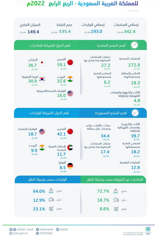 وعلى صعيد الواردات، كشفت الهيئة أنها ارتفعت في الربع الرابع عام 2022 بنسبة 29.9% بمقدار 44.4 مليار ريال، حيث بلغت قيمتها 193 مليار ريال في الربع الرابع 2022، مقابل 148.6 مليار ريال في الربع الرابع عام 2021.