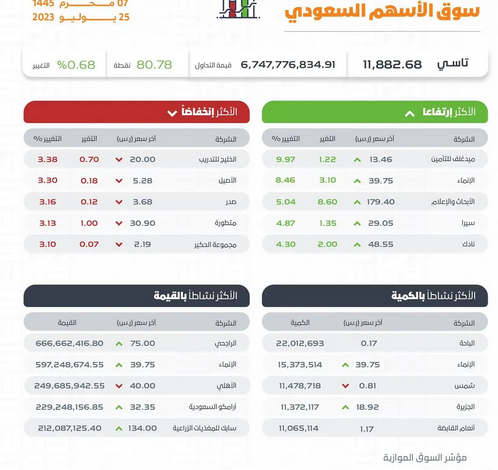 وكانت أسهم شركات ميد غلف للتأمين، والإنماء، والأبحاث والإعلام، وسيرا، ونادك الأكثر ارتفاعًا, أما أسهم شركات الخليج للتدريب، والأصيل، وصدر، ومتطورة، ومجموعة الحكير الأكثر انخفاضًا في التعاملات, حيث تراوحت نسب الارتفاع والانخفاض ما بين 9.97% و 3.38% .