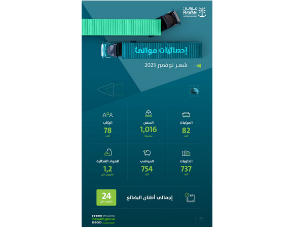 واستقبلت الموانئ التابعة للهيئة 78,264 راكبًا، بزيادة 6.30% عن الشهر المقابل في عام 2022 الذي سجل 73,627 راكبًا، في حين استقبلت الموانئ 82,649 سيارة، بانخفاض قدره 0.84% مقارنة بـ 83,352 سيارة، في الفترة نفسها من العام السابق، فيما ارتفعت الحركة الملاحية بنسبة 2.11% بنحو 1,016 سفينة، مقارنة بـ 995 سفينة، في نوفمبر 2022م.