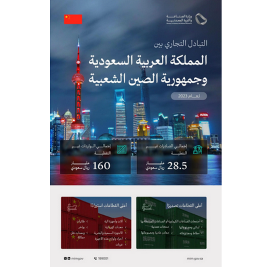 يذكر أن حجم الصادرات السعودية غير النفطية إلى الصين خلال عام 2023م بلغ أكثر من 28 مليار ريال، فيما وصل حجم واردات المملكة من الصين خلال العام نفسه 160 مليار ريال، وتنوعت أهم صادرات المملكة إلى الصين بين منتجات الصناعات الكيماوية، واللدائن ومصنوعاتها، والمنتجات المعدنية، ومعادن عادية ومصنوعاتها، وآلات وأجهزة آلية، بينما تمثلت أهم واردات المملكة من الصين في الآلات والأجهزة والمعدات الكهربائية، والحديد والصلب.