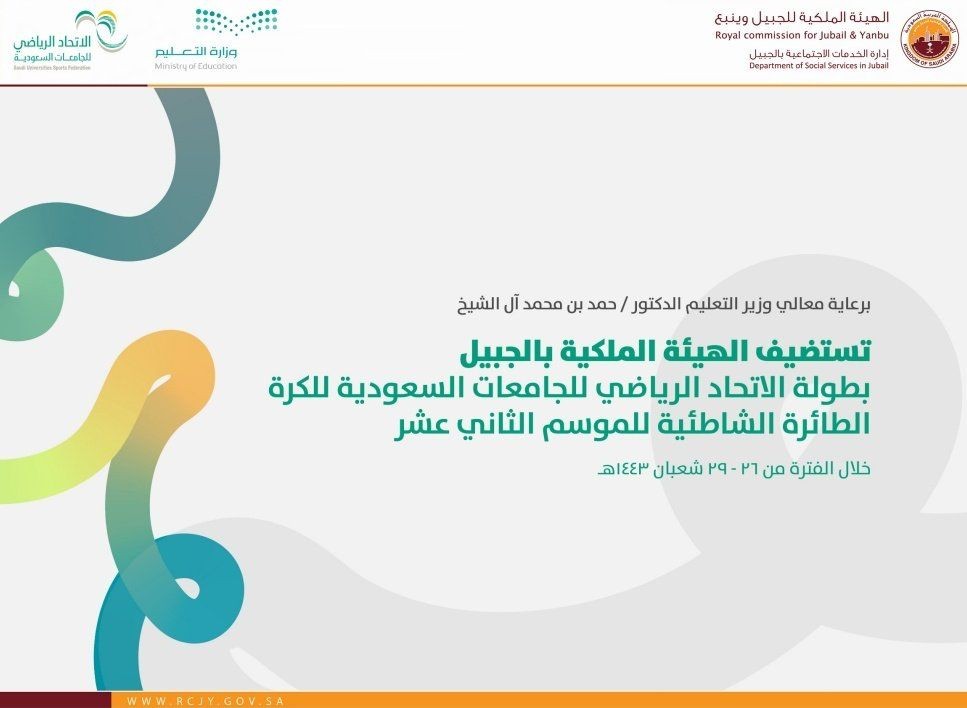 برعاية معالي وزير التعليم الدكتور حمد آل الشيخ، تستضيف الهيئة الملكية بالجبيل غدا الاربعاء بطولة الاتحاد الرياضي للجامعات السعودية للكرة الطائرة الشاطئية (12) بمشاركة 40 فريق يمثلون 22 جامعة .. على شاطئ الشباب بمدينة الجبيل الصناعية بالتعاون مع وزارة التعليم والاتحاد الرياضي للجامعات السعودية