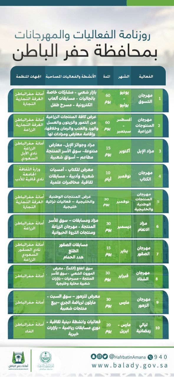 حيث كشفت أمانة حفر الباطن عن تفاصيل سلسلة المهرجانات والفعاليات بالمحافظة بواقع 6 مهرجانات للعام الحالي 2022م و4 مهرجانات للربع الأول من عام 2023م والتي تنطلق منذ يونيو المقبل -بمشيئة الله-، وتتضمن الروزنامة مجموعة من المهرجانات بدء بمهرجان التسوق ومهرجان المنتجات الوطنية والخليجية في نوفمبر بالتعاون مع الغرفة التجارية ووزارة التجارة، يليه مهرجان المنتوجات الزراعية في أغسطس بالتعاون مع الغرفة التجارية ووزارة الزراعة، ثم مزاد الأبل في أكتوبر بالتعاون مع وزارة الزراعة ونادي الأبل السعودي، ومهرجان الكتاب في نوفمبر بالتعاون مع جامعة حفر الباطن ونادي قافية للأدب لينتهي العام الحالي بمزاد الأنعام في ديسمبر بالتعاون مع وزارة التجارة.