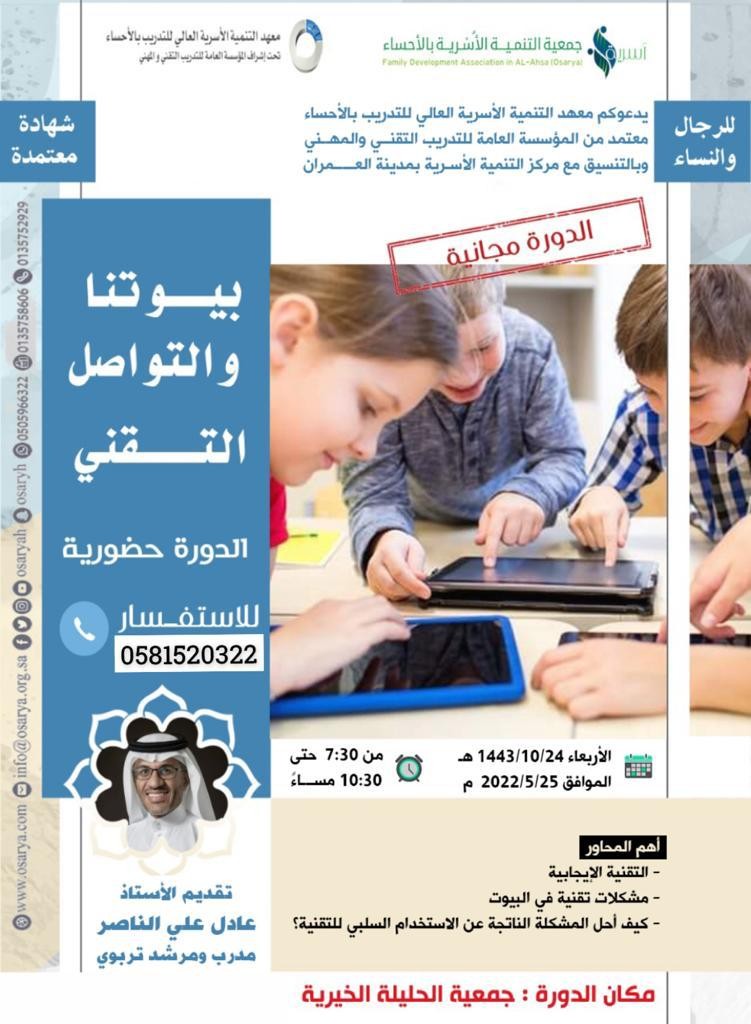 يقيم معهد التنمية الأسرية العالي للتدريب وبالتنسيق مع مركز التنمية الأسرية بمدينة العمران الدورة المجانية بعنوان (بيوتنا والتواصل التقني ) ، يقدمها الأستاذ عادل علي الناصر .