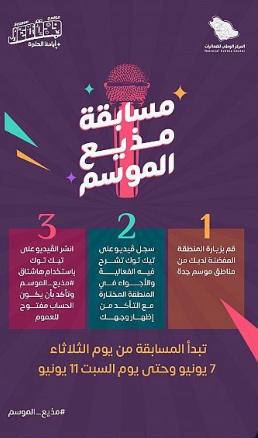 هذا وحدد موسم جدة العمر المسموح به للمشاركة في المسابقة بين 8- 14 سنة، حيث يتمثل المحتوى في تغطية فعاليات إحدى مناطق الموسم، ونشر المشاركات على منصة "التيك توك"، من خلال هاشتاق (#مذيع_الموسم)؛ لإتاحة الفرصة للجمهور لنشر مواهبهم الإعلامية في التغطيات والتوثيق لتجاربهم الجميلة في مناطق فعاليات الموسم.