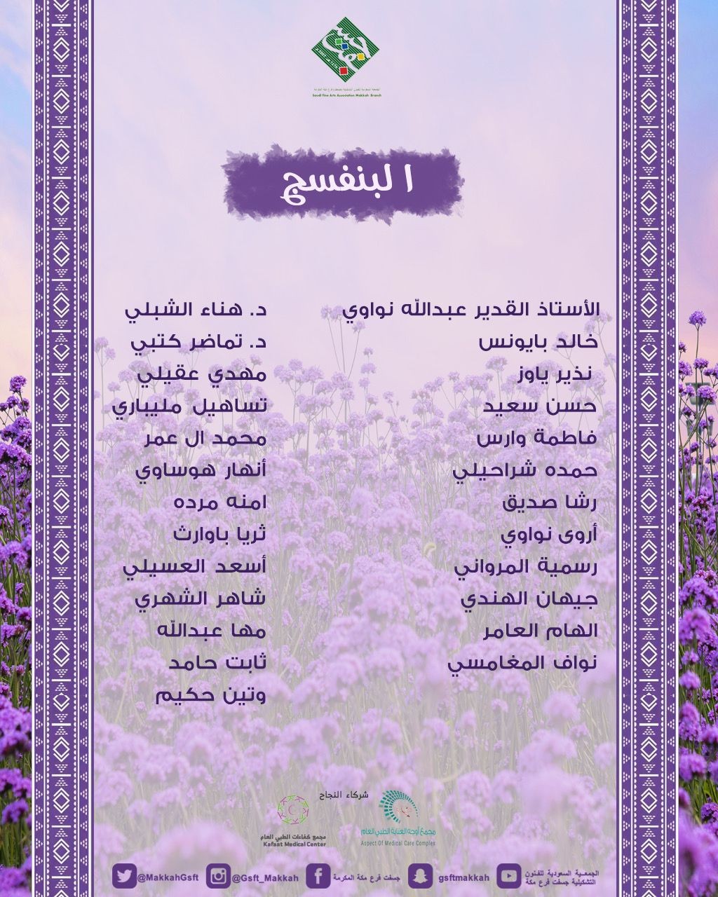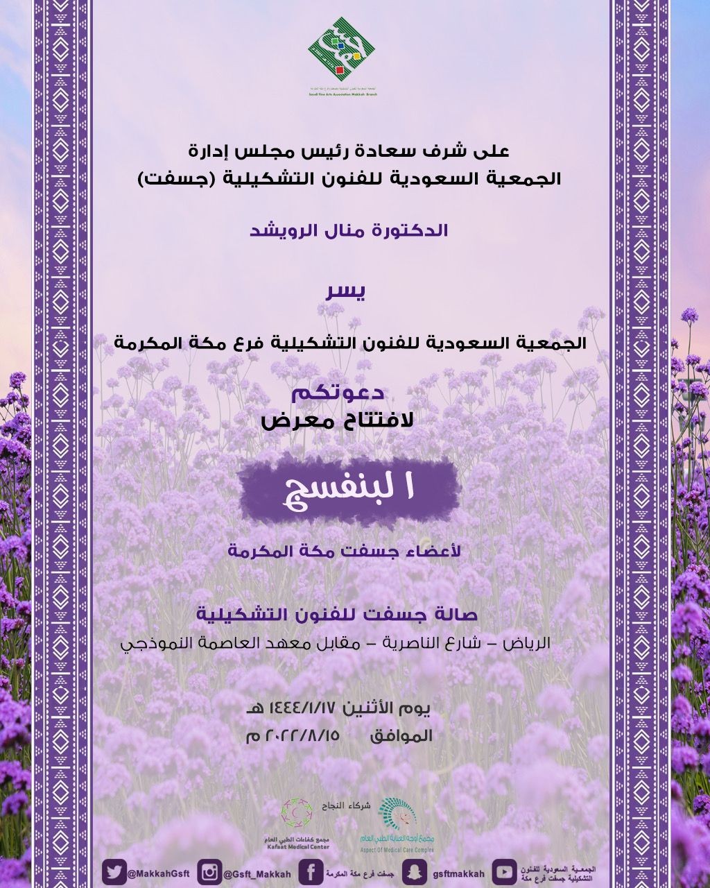 تعتزم جمعية جسفت مكة بإقامة معرض البنفسج على شرف رئيس مجلس إدارة الجمعية السعودية للفنون التشكيلية (جسفت) الدكتورة منال الرويشد ، و قال خالد بايونس مدير فرع جسفت مكة : هذا المعرض لمواكبة تغيير سجاد المراسيم الملكية لاستقبال ضيوف المملكة و بأن البنفسج لون يدل على الفخامة والأناقة والحكمة والوقار فهو بين هدوء اللون الأزرق والطاقة والحيوية من اللون الأحمر، وهو لون الخزامى في فصل الربيع والعيهلان والريحان، فمن هذا المنطلق التراثي الطبيعي أخذت المملكة لون سجادها لاستقبال ضيوفها ليعكس ترحيبها وكرمها من خلال لون الطبيعة معززة ذلك بالأصالة والهوية العربية بفن السدو ويتماهى معرض البنفسج الذي تقيمه الجمعية السعودية للفنون التشكيلية (جسفت) فرع مكة المكرمة في صالة جسفت الرياض مع هذا التغيير والتجديد التي تمر بها البلاد في مجالات مختلفة، تجسيدا لحالة التجديد التي تعيشها المملكة والتطور والازدهار وفق رؤية 2030 بواقع عمل لأعضاء جمعية جسفت مكة المكرمة وعددهم تقريبا خمسة وعشرون فنان وفنانة يوم الاثنين الاثنين ١٧ - ١ - ١٤٤٤هـ الموافق ١٥- ٨ - ٢٠٢٢م بصالة جسفت الرياض والدعوة عامة .