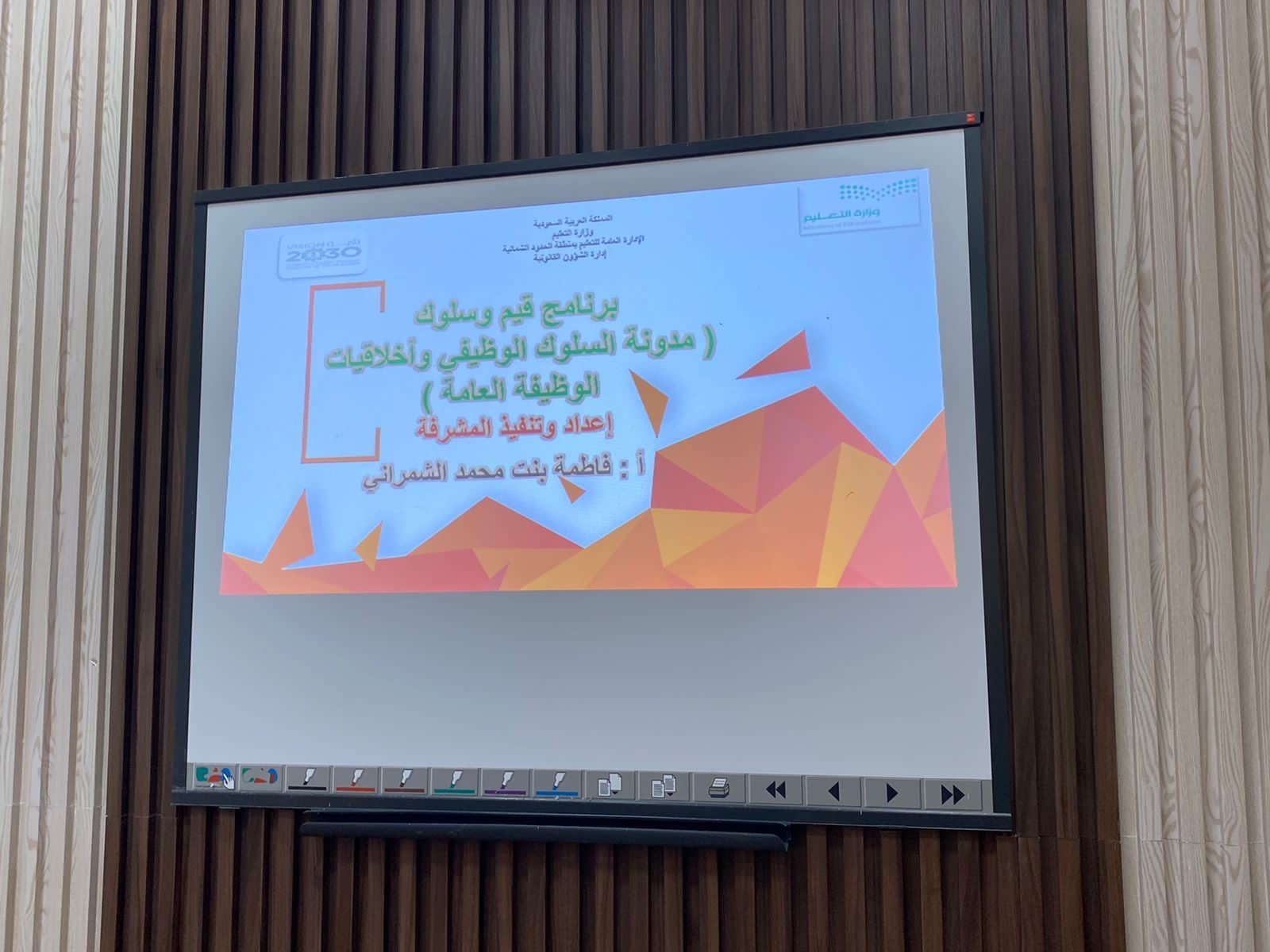 وقدمت المشرفة / فاطمة الشمراني من إدارة الشؤون القانونية ورقة عمل بعنوان ( قيم وسلوك وفق مدونة السلوك الوظيفي وأخلاقيات الوظيفة