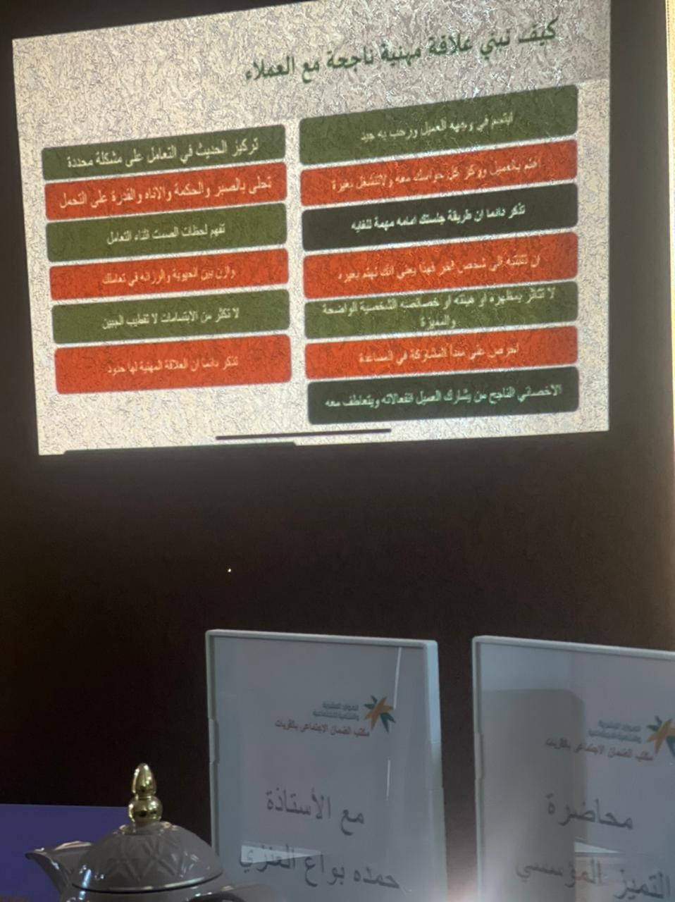 قدم المحاضره المدربة إ/حمده بواع العنزي حيث تناولت عدد من المحاور اهمها كيف تبني علاقه مهنيه ناجحه مع العملاء ودور الموظف اتجاه العميل واهم خمس اشياء في مقدم الخدمة في المنظمه وانماط المراجعين وكيفية التعامل معهم وصفات مقدم الخدمة في المنظمةومهارات مهمه في خدمة العملاءوكيف تكون موظف خدمه عملاء محترف وصفات الاتصال الناجح .