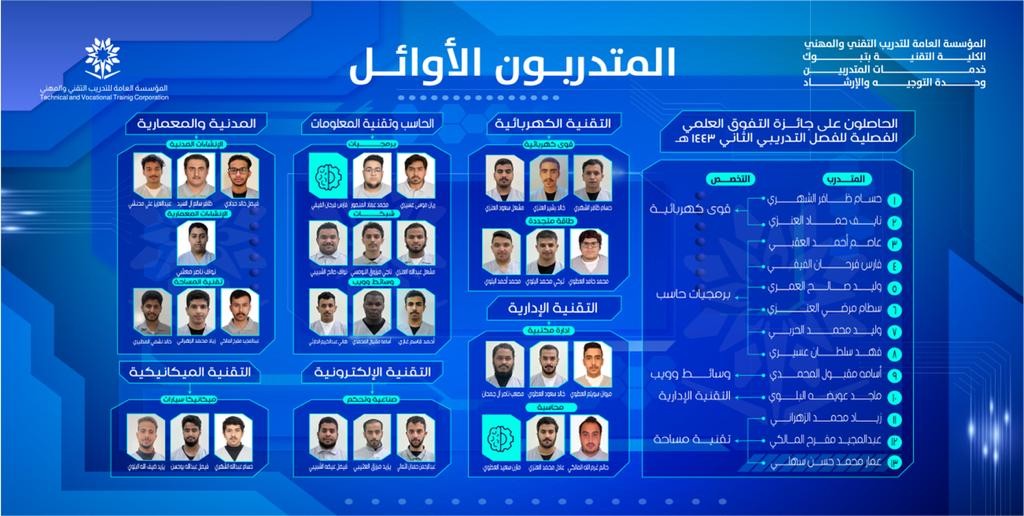 كما بلغ عدد المتدربين المستمرين المتفوقين ( 34 ) متدرباً توزعوا على اثنى عشر تخصصا وهي كالتالي ( الشبكات ، البرمجيات ، وسائط ويب ، الإدارة المكتبية ، المحاسبة ، القوى الكهربائية ، الطاقة المتجددة ،التقنية المعمارية ، تقنية المساحة ، التقنية المدنية ، التقنية الميكانيكية ، التقنية الإلكترونية ).