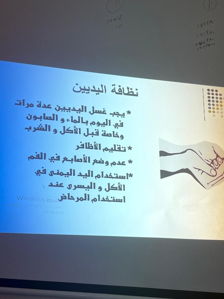 قدمتها الممرضة / وضحاء محمد العنزي من مركز صحي الحميديه حيث تناولت في هذه المحاضرة الحديث عن النظافة الشخصيه بصفة عامة بما في ذلك نظافة اليدين والقدمين والطريقة الصحيحة لنظافة العينين بالاضافة الى نظافة الانف والاسنان والمحافظة على نظافة الشعر .